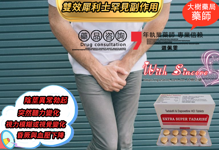 - 若出現持續性頭痛、視力模糊或陰莖異常勃起(約12小時),應立即就醫。