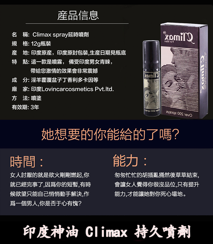 印度神油 Climax 持久噴劑 是專為男性設計的延時噴劑,讓您在性愛過程中更具持久力與自信,幫助改善早洩困擾,讓性愛體驗更加愉悅,享受更長久的親密關係。