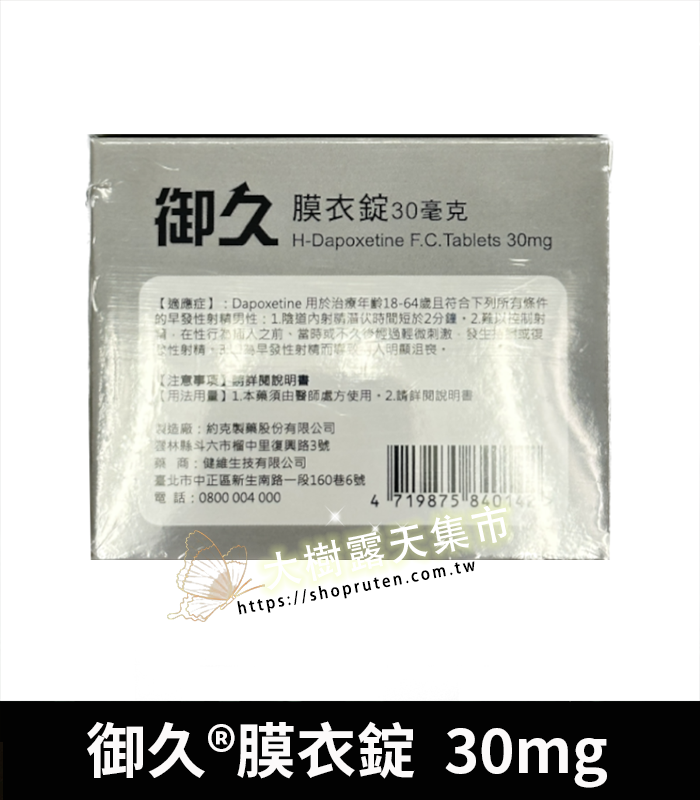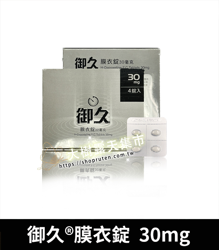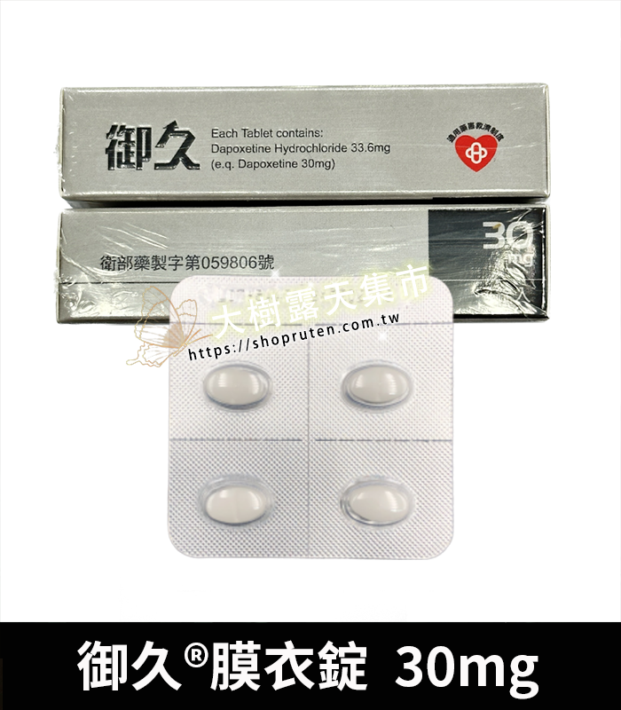 御久是一款專為改善男性早洩(Premature Ejaculation, PE)設計的處方藥,主成分為 達泊西汀 Dapoxetine 30mg,屬於選擇性血清素再吸收抑制劑(SSRI)類藥物。能有效延長射精時間、增強控制力,提升性生活品質與信心。