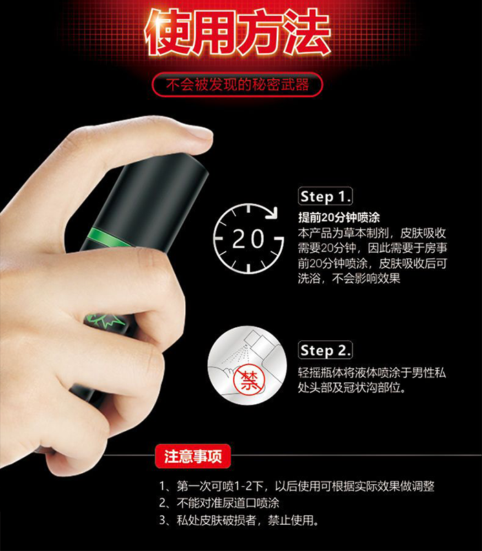 綠騎士持久液使用方法:房事前10-20分鐘,取綠騎士噴涂在龜頭冠狀溝處,使其均勻塗抹,輕輕按摩3分鐘,藥液充分吸收後方可進行房事。