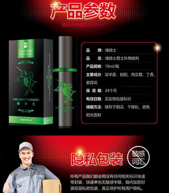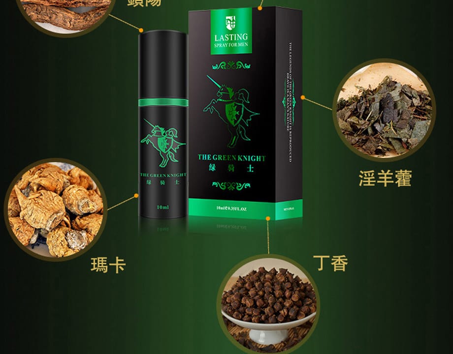 法國綠騎士持久液,針對男性早洩問題而開發的持久產品,性愛時間太短,力不從心草草了事的解決了 讓愛人達不到高潮,綠騎士專為男性設計研發,精選植物精華,吸收快,效果強勁,噴一噴激發性欲,給她愛的時間久一些 也多一些享受,重振男人雄風。