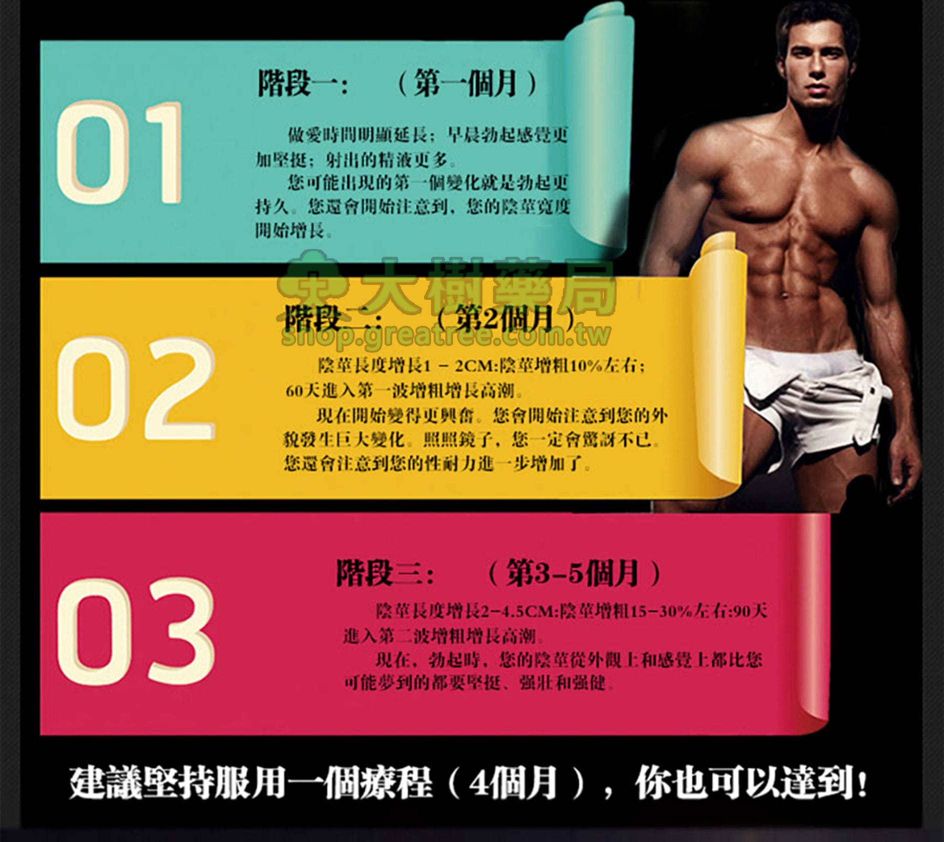 第1個月:做愛時間明顯延長,早晨勃起感覺更加堅挺,射出的精液更多,陰莖開始增長
