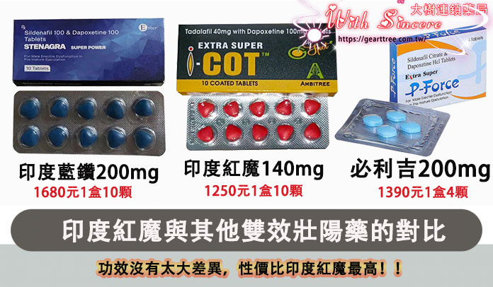 | 印度紅魔 | 他達拉非 40mg + 達泊西汀 100mg | 頭痛、臉紅、噁心 | 10% | 6% |